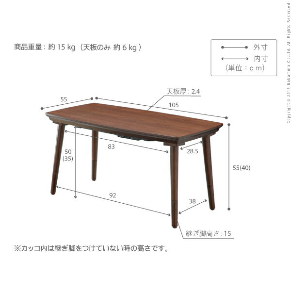 【仕様】 天板:天然木化粧繊維板(ウォールナット) 脚部:天然木(ラバーウッド) フラットヒーター(130W・中間スイッチ式) ◎一部組立(脚部取付) 【サイズ】 幅105x奥行55x高さ55/40cm(継脚15cm) 重量:約15kg 天板サイズ:幅105x奥行55cm・厚み24mm・約6kg 脚間:92(83)/38(28.5)cm 中天板下高さ:35/50cm 商品コード番号(I-3301824)※在庫状況や返品、キャンセル等について こちらの商品はメーカー直送商品となります。